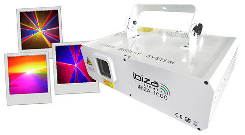 Caractéristiques IBIZA Light IBIZA 1000 Laser RVB 1W Edition Limite du LAS-1000RGB en Finition Blanche 3 diodes laser : 1x Rouge 300mW (650nm), 1x Verte 100mW (532nm) et 1 Bleue 600mW (445nm) Scanners optique haute vitesse : 20 Kpps Modes de fonctionnement : Automatique (faisceau ou animation), Musical, Maître/Esclave, DMX et ILDA Réglage possible de la sensibilité du micro 12 canaux DMX 1 entre ILDA (DB-25) 1 entre et 1 sortie DMX (XLR 3 broches) Compatible avec le logiciel PANGOLIN QUICKSHOW, PHOENIX, ISHOW… (non fournis) Dimensions : 340 x 250 x 150 mm Poids : 4 kgs Les lasers d’une classe supérieure 2 sont réservés aux activités professionnelles de spectacle et d’affichage.